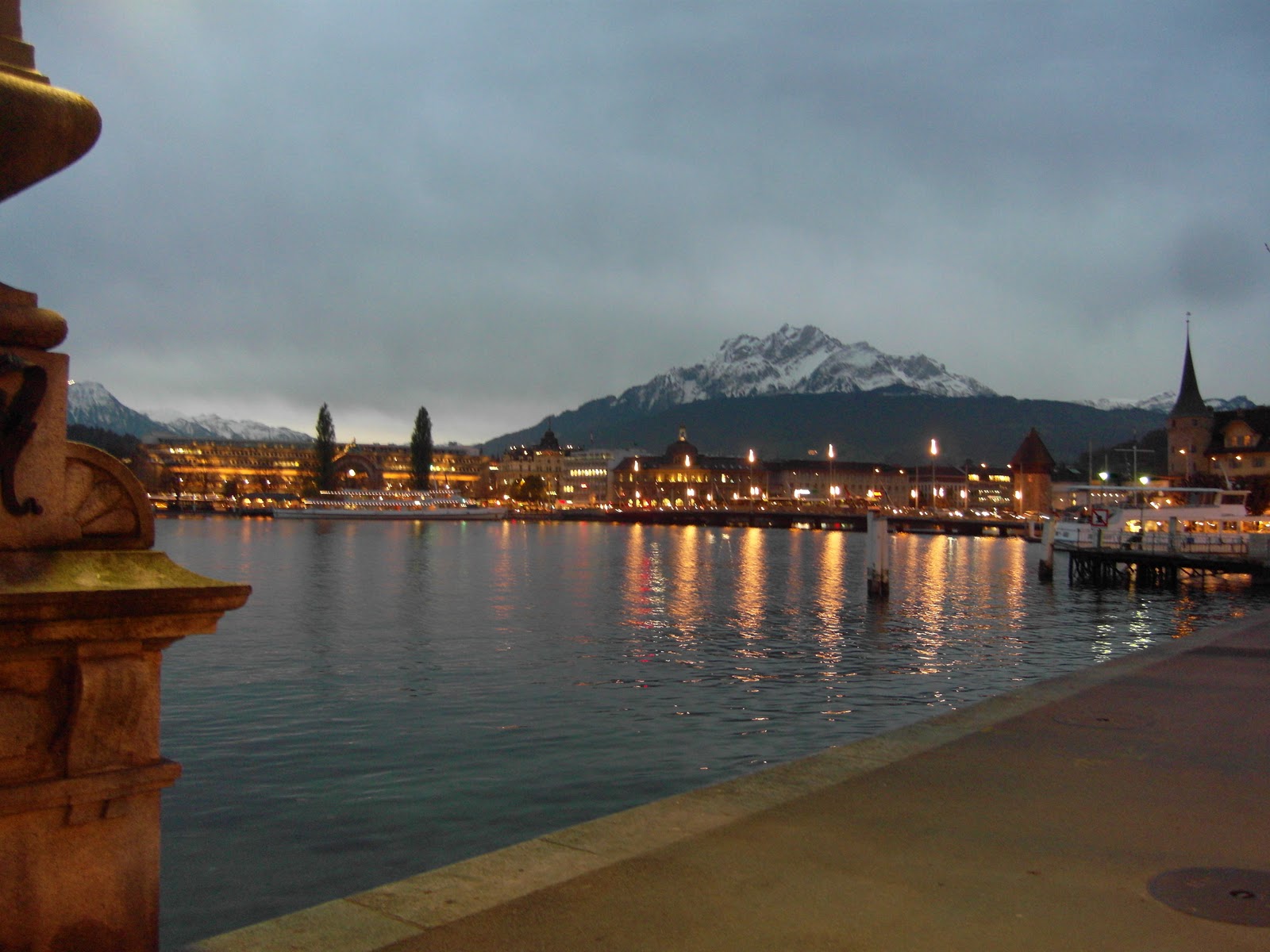 Our week long trip has begun! Brady, Kevin, Jake and I left for the train station at 9:15am. The bus was running really slowly but luckily we made it with about 10 minutes to spare so it was fine. We got on the train and got our seats. The train was a railjet so it was really nice and a faster train. I have gotten to really like riding on trains because it is such a good way to see the country. It was a beautiful ride! At one point all of the ground was covered in snow! It was so cool! And it made me really excited for it to snow. So beautiful! At one point this couple came by and started talking to us. I am pretty sure it was German but I had NO idea what they were saying. I am guessing it was Switzerland dialect but I could not pick up one word which was strange. I thought they were saying we were in their seats but it did say it was free. I don’t know. It was a weird situation but everything was fine in the end. We had to switch trains in Zurich and then had an hour train ride to Luzern. The whole trip took about 6 hours. As soon as we got to the train station we went and bought train tickets for our way back to Zurich on Monday. It was funny because the guy I talked to to get the tickets instantly spoke English to me when I asked a question in German. That has happened to me a lot actually. Like when I went shopping yesterday. (Yes, I actually went shopping! And I was successful!) I figure it is better to try German and then English than to not try at all. It is kind of funny though.